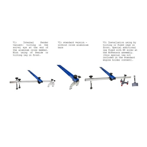 Mootori toestamise rakis profikasutajale. Võimalik seada 6 toetuspunkti erinevate toetusjalgade kombinatsioonina. Komplektis reguleeritava kallutusnurgaga tugijalad. samuti suures ulatuses (120-200 mm) reguleeritava kõrgusega tugijalad. Tugijalgade otstes vulkaniseeritud kummipadjad- ja plaadid. mis hoiavad ära värvikahjustused kereosadel. Saab toetada erinevates kombinatsioonides ja erinevate nurkade all tiivaservadele. McPherson amortisaatorite otstele või tugikaussidele. auto esiosa esipaneelile jne. Igas suunas reguleeritav. Kvaliteetne ja tugev konstruktsioon. kombineeritud tugevast teras- ja alumiiniumprofiilist tagab paigaltnihkumise ja läbivajumise vaba töö ka raskete mootorite (V6. V8 ...) puhul. Kolm hoidekonksu (440 mm reguleeritava pikkusega) kinnituvad peatala külge "ämbliku" kaudu. millel on reguleeritava pikkusega (210-340 mm) jalad. mis lisaks on 360 kraadi pööratavad. Seega on alati võimalik leida antud mootorile sobivad stabiilsed kinnituskohad ja seada see täpselt soovitud kõrgusele või nurga alla. Kokkukeevitatud lülidega ja kiirkinnitusega hoideketid võimaldavad mootorit haarata komponentide piisavalt tugevatest kohtadest.