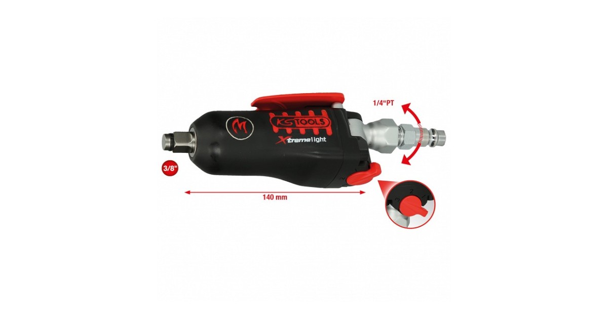 Sobib ideaalselt töötamiseks kitsastes kohtades. Praktilise ümberlülitusnupuga (vasakule/paremale). Kerge käsitsemine. 3-kordne pöördemomendi seadistamine. Võimas tihvt-löögimehhanism. Summutatud vibratsioon. Õhuühendus 150° pööratav. Õhutarve 59 l/min. Max moment 108 Nm. Min vooliku läbimõõt 10 mm. Tühikäigu kiirus 12000 p/min. Kogupikkus 140 mm. Õhuliides komplektis kaasas. Kaal 550 g.