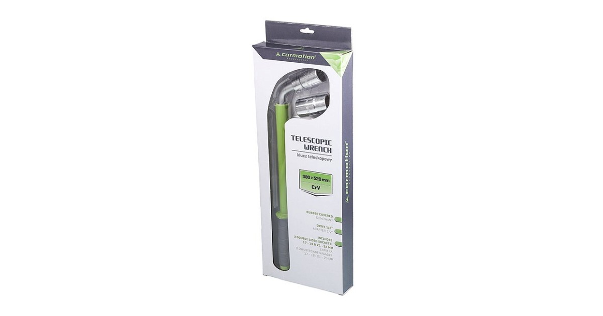 CrV terasest teleskoopvõti. mis on kaetud kaitsva kroomi ja kummikattega. Pikendatav 380-520 mm. Komplektis kaks kahepoolset padrunit: 17/19 mm ja 21/23 mm.