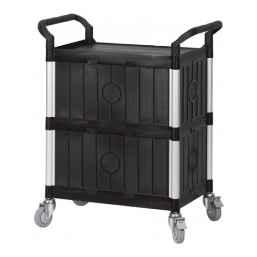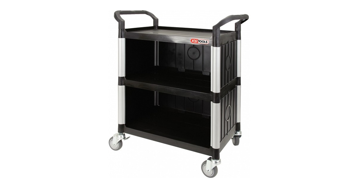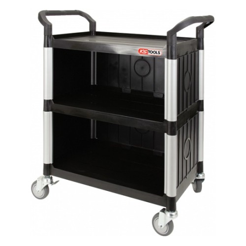 3-tasapinnaga ratastel töötasapind-käru. Plastkonstruktsioon. alumiiniumpostidel. Tagaseinaga. Maksimaalne kandejõud 200 kg. 100 mm läbimõõduga rattad. Kerge ja tugev konstruktsioon. Käru pikkus 860 mm. käru sügavus 480 mm. käru kõrgus 1010 mm.