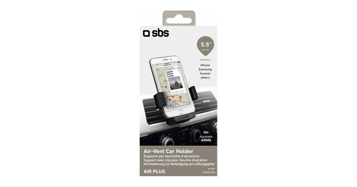 Kvaliteetne nutiseadme hoidik firmalt SBS. Kinnitub auto armatuuris olevate õhuava ribide külge. Pehmed toetus- ja hoidepinnad tagavad. et seadet ei kriimustata. Kuni 5.5" ekraaniga seadmetele.