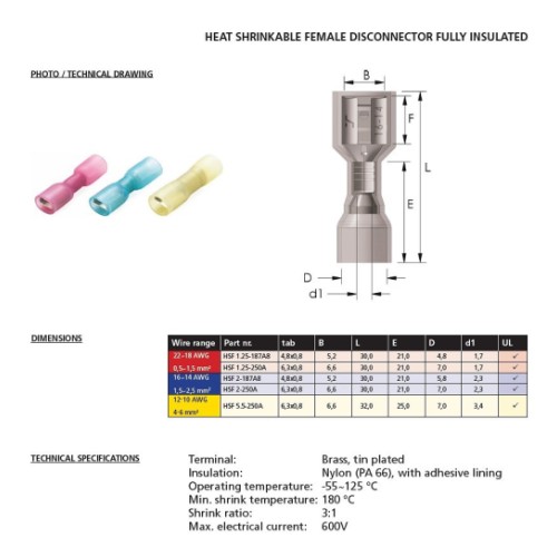 Erakordse isolatsioonivõimega kuuma-. külma- ja veekindlad termokahanevad juhtmeotsikud. Laius 6.6 mm. juhtmele 0.5-1.5 mm² (22-18 AWG). Materjal: polüamiid liimkattega (isolatsioon). elektrotinaga kaetud messing (juhtmeotsik). Kahanemissuhe 3:1. Kasutustemperatuur -55°C kuni +125°C. Min kahanemistemperatuur +180°C. Max pinge 600V. max voolutugevus 10A. Pakis 100 tk.
