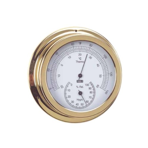 ANVI kvaliteetne termomeeter/hügromeeter. Poleeritud messing. Mõõtmed: 150 x 120 x 45 mm.