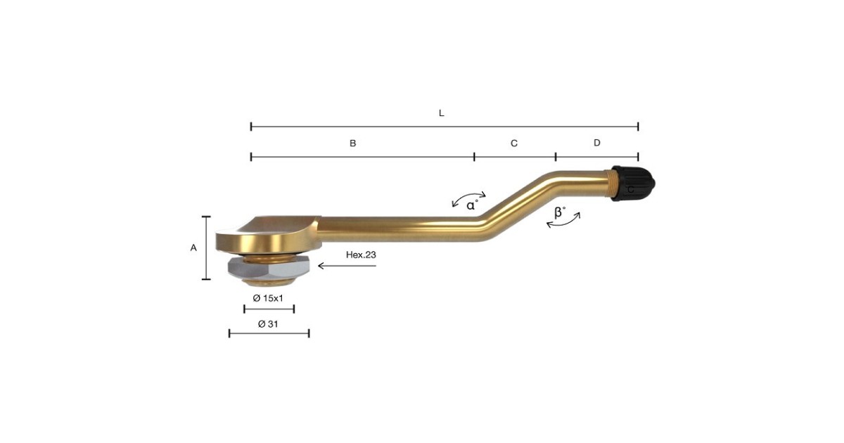 TL-ventiil veoki-/haagise rehvile. Ventiiliavale 20.5 mm. ETRTO:V3-18-4. Pingutusmoment 25-31 Nm. Tootja Wonder. Itaalia.Mõõdud:A=21 mmB=51 mmC=21 mmD=38 mmL=110 mm α°=138 β°=138
