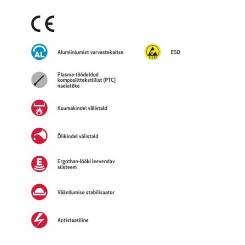 Kerge. Vibram® kuuma- ja õlikindel välistald. FX3 Exalter2 sisetald. antistaatilised omadused. polsterdatud saapasääre serv. hingav sisetald. Boa® kinnitusmehhanism. kiirkinnitus. väändumise stabilisaator. vetthülgav. spetsiaalselt väljatöötatud detailid. poron® XRD® kahekordsed lööki leevendavad alad. vastab standardile IEC 61340-5-1 (ESD). antibakteriaalne kiud - vähendab lõhna teket. Kaitseb järgmiste ohtude ja vigastuste eest - varbavigastused. naelaläbistus. nihestused. EN ISO 20345:2011. S1 P SRC HRO.