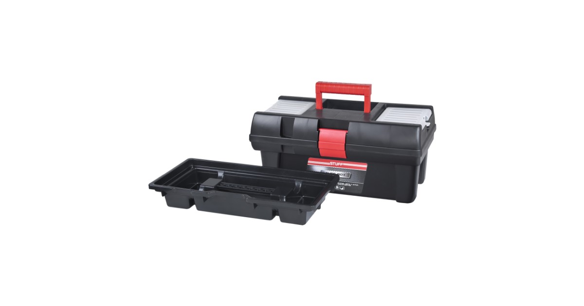 Plastist tööriistakast, eemaldatav siseosa, plastkustus, kaanel hoiusahtlid.