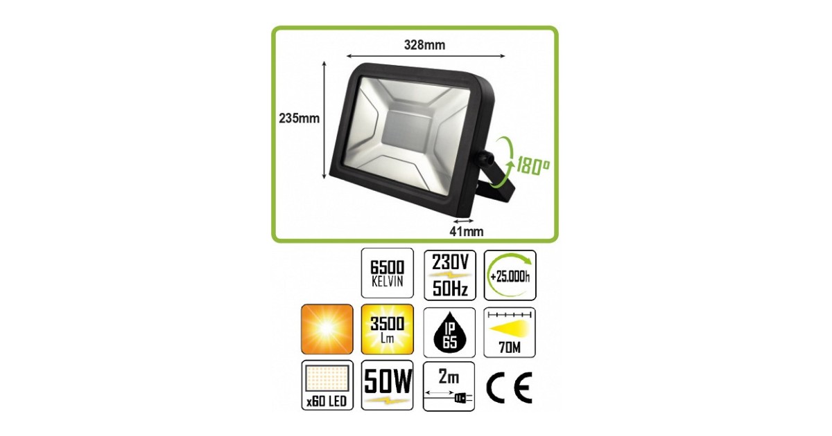 Professionaalsesse kasutusse mõeldud LED prožektor. 50 W. 3500 lm. 6500K. IP65. Valgusvihu pikkus kuni 70 m. Toitekaabel 2 m. 180 kraadi pöörataval jalal. Võimalik juurde osta statiiv koodiga 53506J.