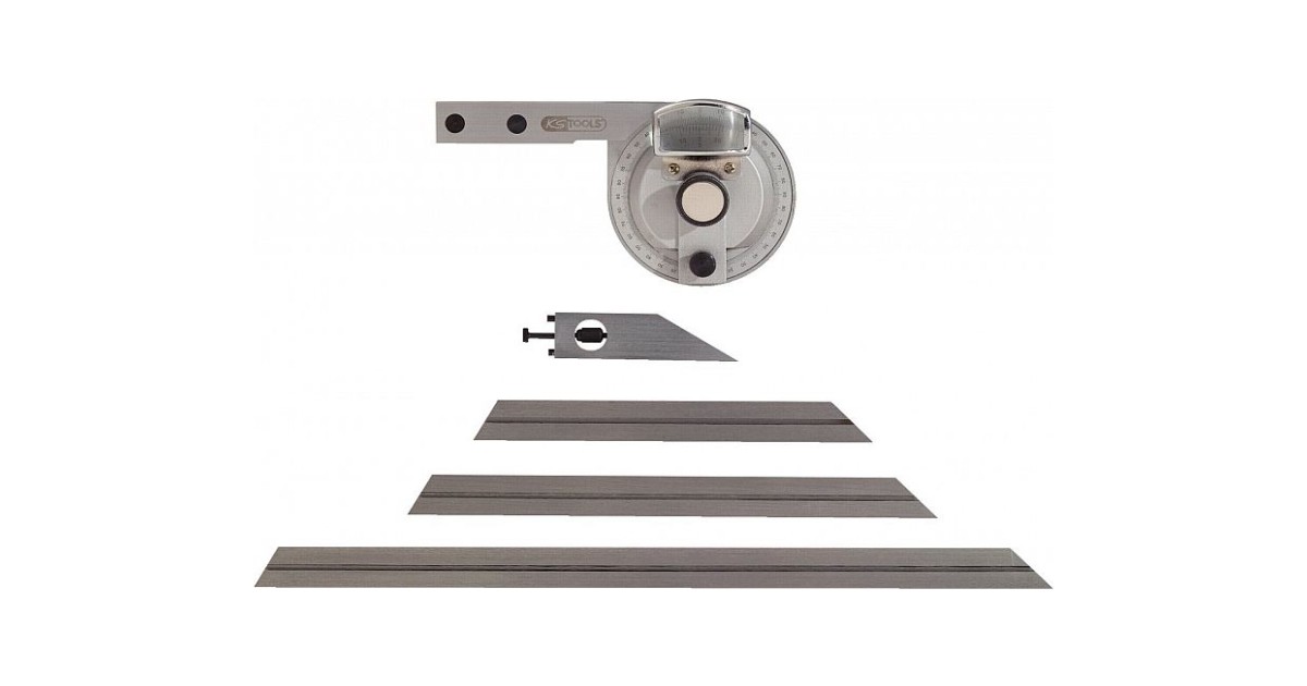 Vahetatav mõõtelaud. Malli mõõteskaala 0-360°. Kolm mõõtelauda 150-200-300 mm. Roostevabast terasest. Mõõteskaala stantsitud ja värvitud. Lukustus liblikmutriga.