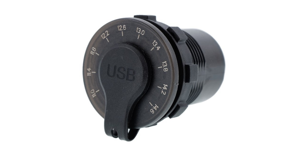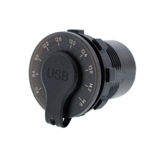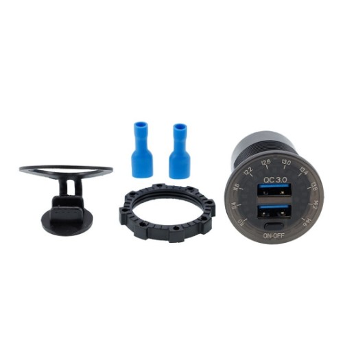 USB kiirlaadija ja voltmeeter. mille võib paigaldada auto sigaretisüütaja asemele või siis puurida täiesti uue pesa (30 mm) seadme paigaldamiseks. Kaks USB pesa. ON-OFF lüliti ja LED-indikaatormärgutuled. mis näitavad auto generaatori laadimist. Soovitame laadija paigaldada läbi 15 A kaitse.