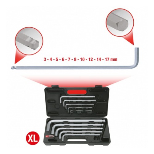 Ekstra pikk mudel. Pikas otsas kuulpea. Üleni karastatud. Matt kroom. Eriteras. Plastkarbis.Komplekt sisaldab: L-kuuskant ekstra pikk 3-4-5-6-7-8-10-12-14-17 mm