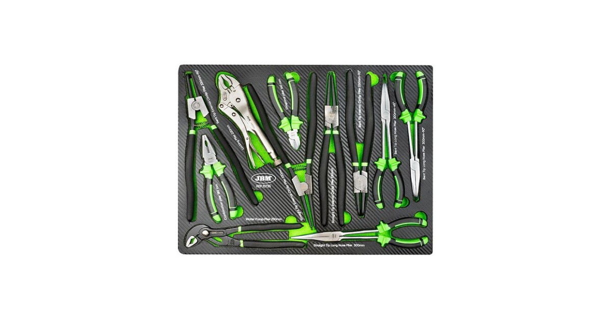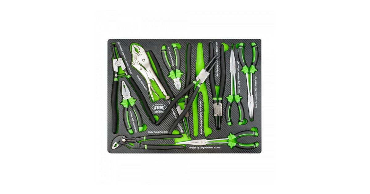 PU-paneelis tööriistade komplekt. mida võib kasutada iseseisvana või siis tööriistakärus või lauasahtlis. Keemia- ja õlikindel materjal. Paneeli mõõdud 400x533 mm.Komplekt sisaldab: Kullinokad (lukustusnupuga) 250 mmKülglõiketangid 160 mmNäpitstangid 180 mmPikad 45° painutatud teravotsaga näpitsad 3...