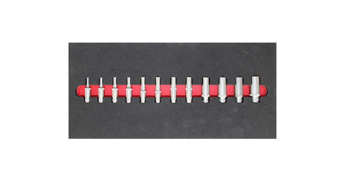 1/3 moodul. 2-värviline. Süvendipõhjad punast värvi. et oleks puuduv tööriist kergelt märgatav. Pestav ja puhastatav. Padrunite profiil klassikaline kuuskant.Komplekt sisaldab:1/4" pikk padrun 4-4.5-5-5.5-6-7-8-9-10-11-12-13-14 mm