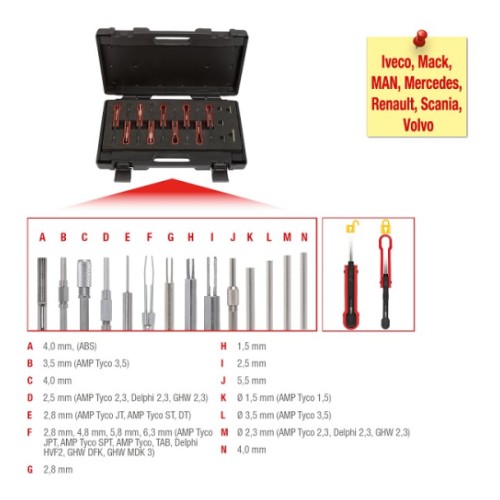 Veokite ja haagiste (24 V) elektripistikute avamise-sisestamise komplekt. Katab üle 90% võimalikets juhtudest. 360° pööratava pidemeosaga. mis moodustab terakaitse. Sobib: Iveco. RVI. MAN. Mercedes. Renault. Scania. Volvo.