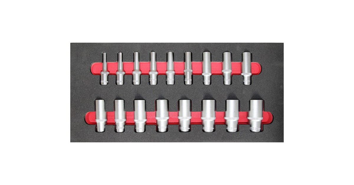 1/3 moodul. 2-värviline. Süvendipõhjad punast värvi. et oleks puuduv tööriist kergelt märgatav. Pestav ja puhastatav. Padrunite profiil klassikaline kuuskant.Komplekt sisaldab:3/8" pikk padrun 6-7-8-9-10-11-12-13-14-15-16-17-18-19-20-21-22 mm