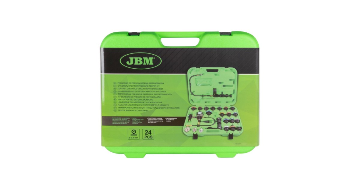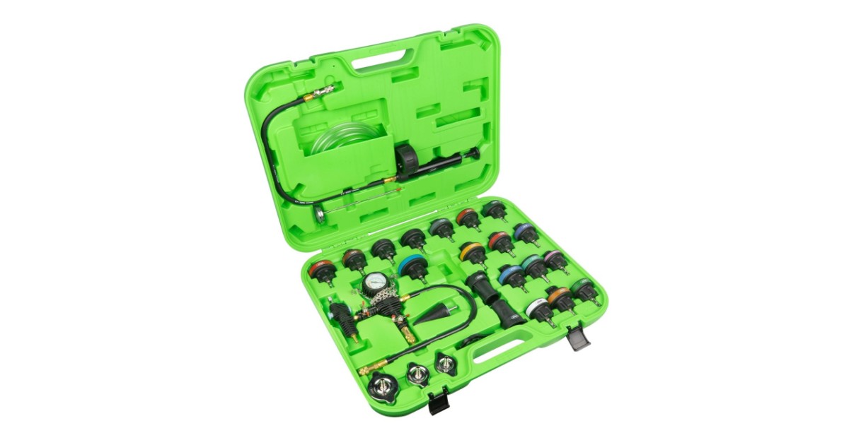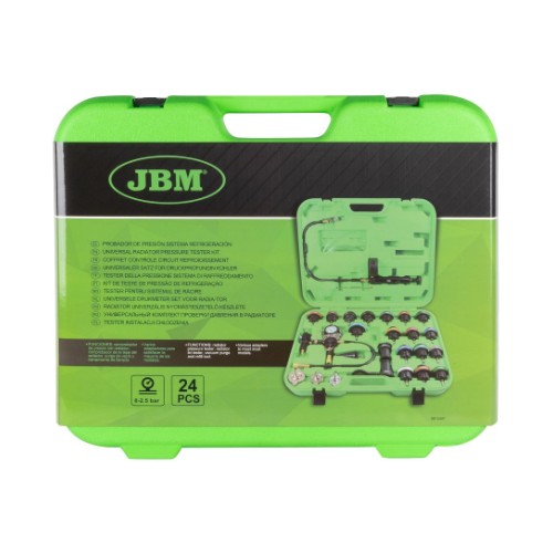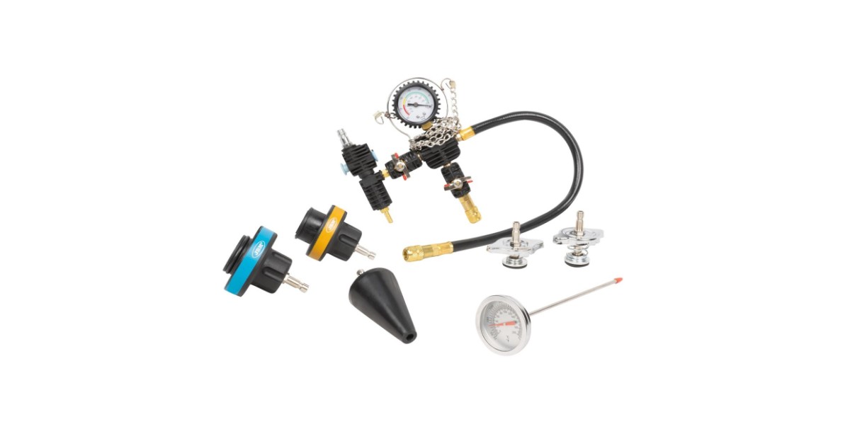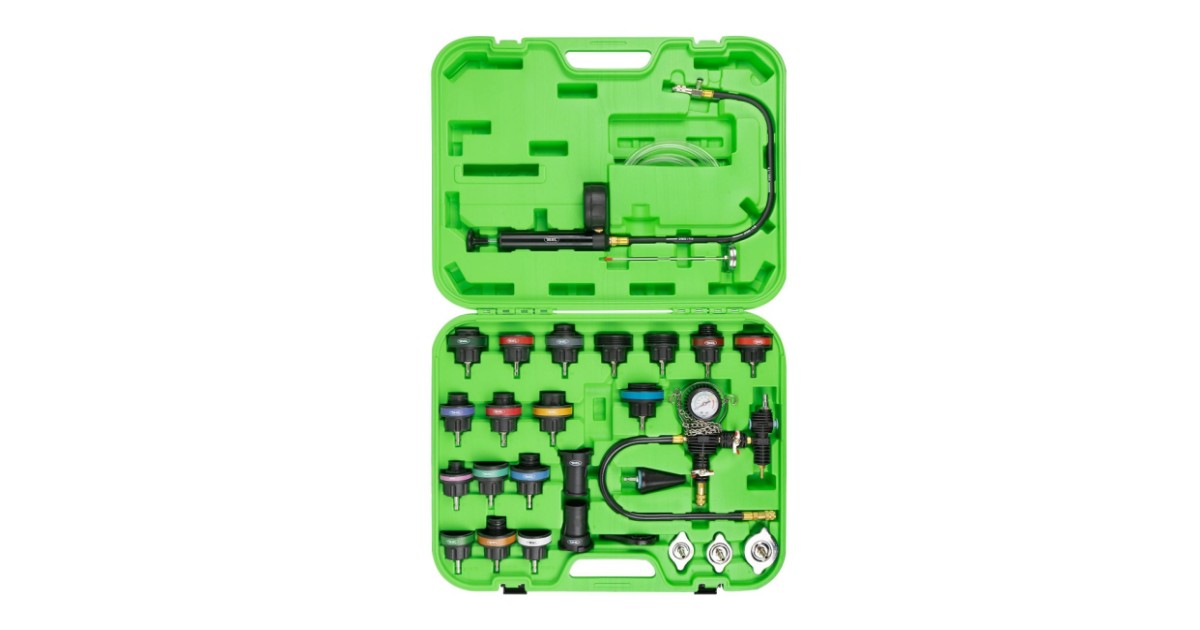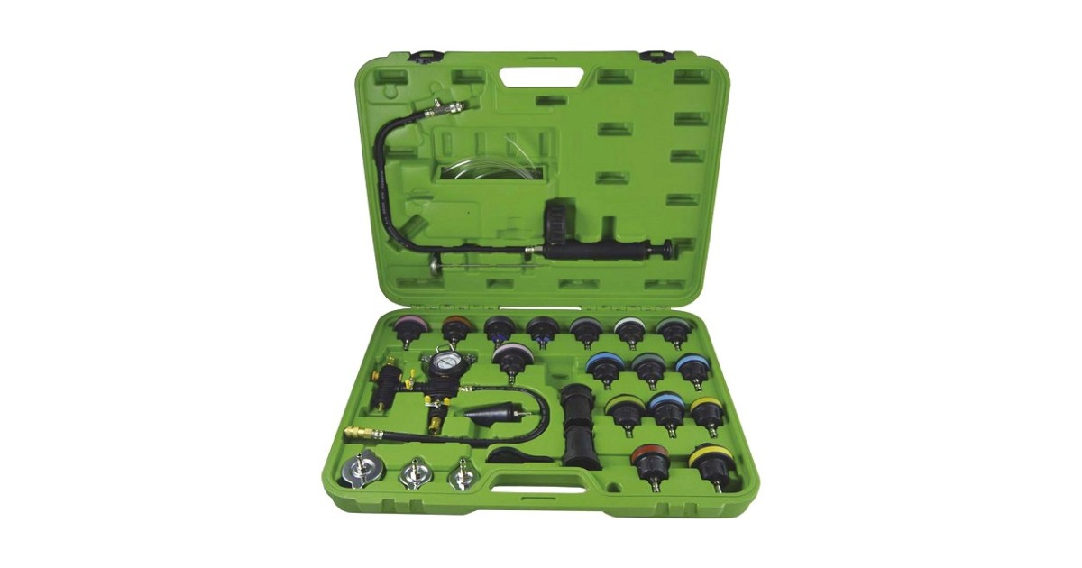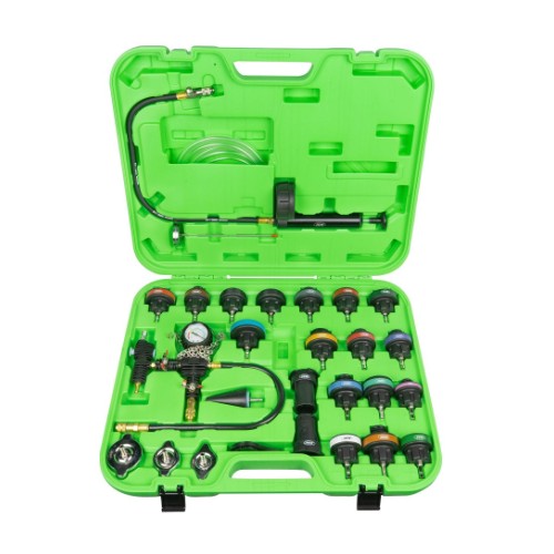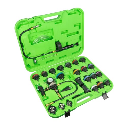 Universaalne ja katva sisuga komplekt mille abil saab leida jahutussüsteemi lekked. Samuti saab komplekti kasutada jahutusvedeliku väljaimemiseks süsteemist. Komplektis käsipump manomeetriga 0-2.5 bar. Adapterid enamikele Euroopa. Jaapani. Korea ja ka mõningate Ameerika autode jahutussüsteemidele (19 tk). Komplektis kaasas metallist mõõtevardaga kraadiklaas 0-200ºC. tänu millele saab teostada testimist tootj poolt määratud temperatuuride juures.