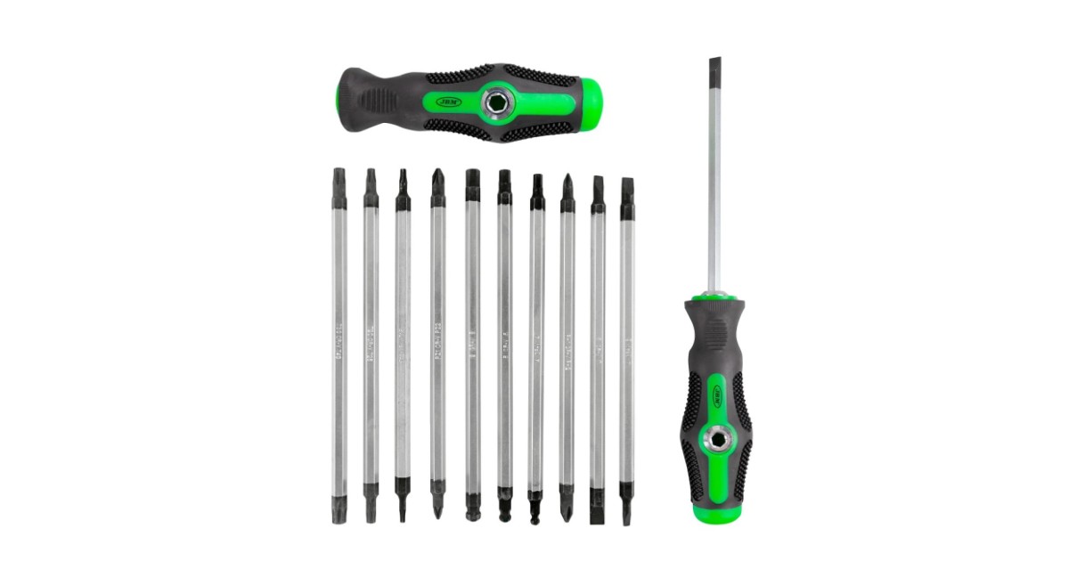 Ainulaadne kruvikeeraja turul - vahetatavad otsikud ja lisaks kasutatav T-peaga kruvikeerajana. Komposiidist pidemeosa. 2-poolsed pikad keeramisotsikud. 20 erinevat. Enamlevinud ristotsikud. lapikotsikud. Torx otsikud ja kuuskant otsikud. Plastkohvris.