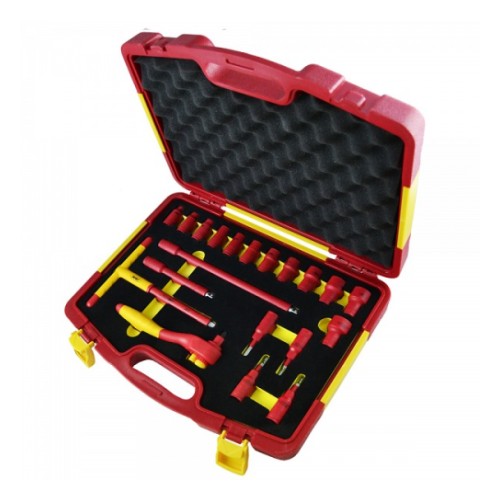 Katva valikuga VTD/1000V tööriistade komplekt. Kasutatakse näiteks elektritöödel. elektri- ja hübriidautode remonditöödel (lähtuda tootja poolsetest nõuetest). Tööriistad pehmes PU- paneelis. Tugevas plastkohvris.Komplekt sisaldab:3/8" VDE padrun 8-10-11-12-13-14-16-17-18-19-21-22 mm3/8" VDE tirrvõt...