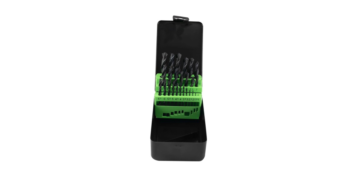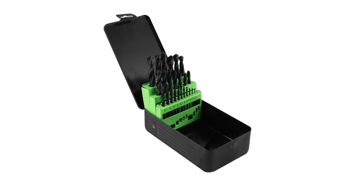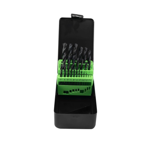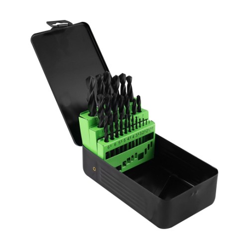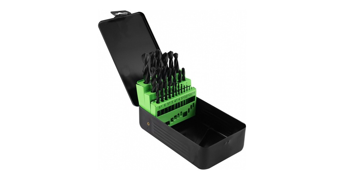 Metallkarbis HSS-R metallipuurid hobi ja kodukasutamiseks. HSS 4241 eriteras. must viimistlus. Komplekt sisaldab mõõte 1.0-1.5-2-2.5-3-3.5-4-4.5-5-5.5-6-6.5-7-7.5-8-8.5-9-9.5-10-10.5-11-11.5-12-12.5-13 mm.