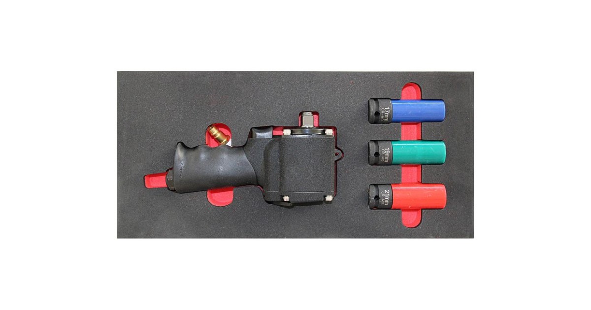 1/3 moodul. 2-värviline. Süvendipõhjad punast värvi. et oleks puuduv tööriist kergelt märgatav. Pestav ja puhastatav. Lukustusrõnga näpitsa otsad vahetatava tööosaga.Komplekt sisaldab:1/2" kompaktne suruõhu löökmutrikeeraja 680 Nm1/2" veljepadrunid (plastkaitse. õhukeseseinalised) 17-19-21 mm