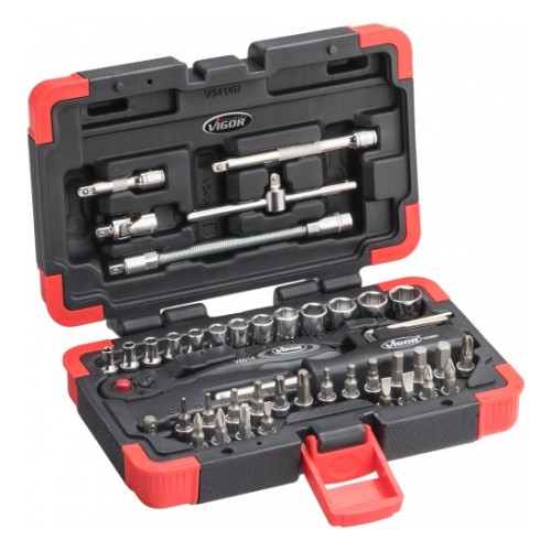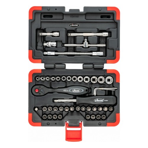 VIGOR Steckschlüssel Satz V2414N on 46-osaline padrunite komplekt. mis sisaldab katvat valikut 1/4" padruneid ja padrunotsikuid. Tööriistad on valmistatud CrV eriterasest. Tööriistad on poleeritud pinnaga. tagamaks kerge puhastatavuse. Tööriistad on vastupidavas plastkohvris. Kohvri mõõdud 134x225x60 mm. Soovitame VIGOR´it professionaalidele. kes hindavad ergonoomikat. töö efektiivsust ning mõistliku hinnaga vastupidavaid tööriistu! Täpsema ülevaate saamiseks külasta vigor-equipment.com.