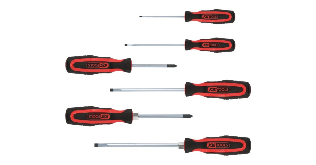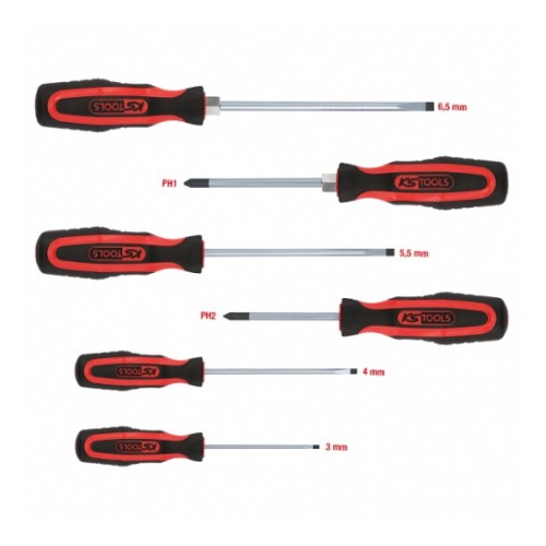 ERGOTORQUEplus kruvikeerajate komplekt. Kahekomponendiline pidemeosa. Riputusavaga. Karastatud tipuosa. Kroom vanaadiumist.Komplekt sisaldab:Lapikkruvikeeraja 3x155-4x180-5.5x205-6.5x230 mmRistkruvikerajad PH1x180-PH2x205 mm