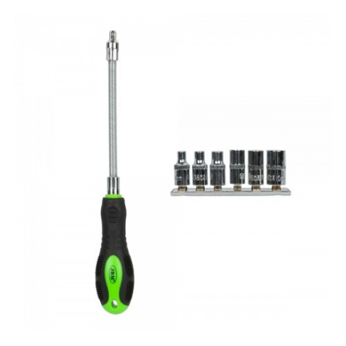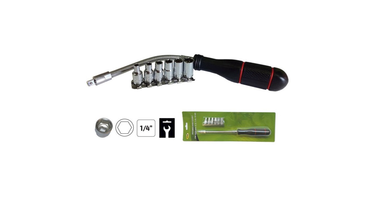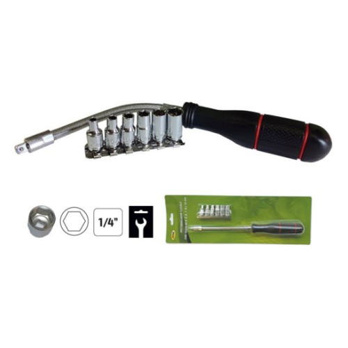 Painduva kaelaosaga kruvikeeraja. millel otsas 1/4" padrunite adapterotsik. Komplektis padrunid 4-5-6-7-8-10 mm. Kasutatakse raskesti ligipääsetavates kohtades. nt voolikuklambrite lahti keeramiseks.