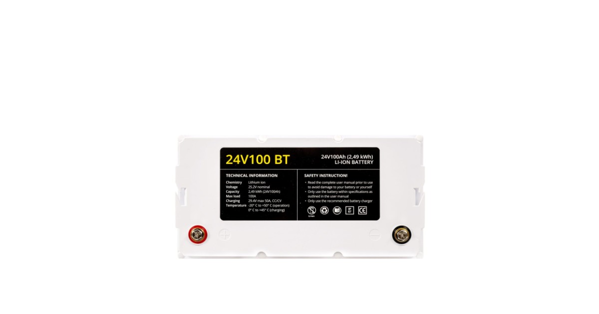 NEW! The 24V100 BT Lithium Battery boasts an output of 100Ah (2.49kWh), weighs 14.3Kg, is IP67 waterproof and has a 3 year warranty. It can be charged via a compatible AC charger, ‘on the go’ via your outboard engine in combination with the Range Extender and via solar panel. The battery comes equip...