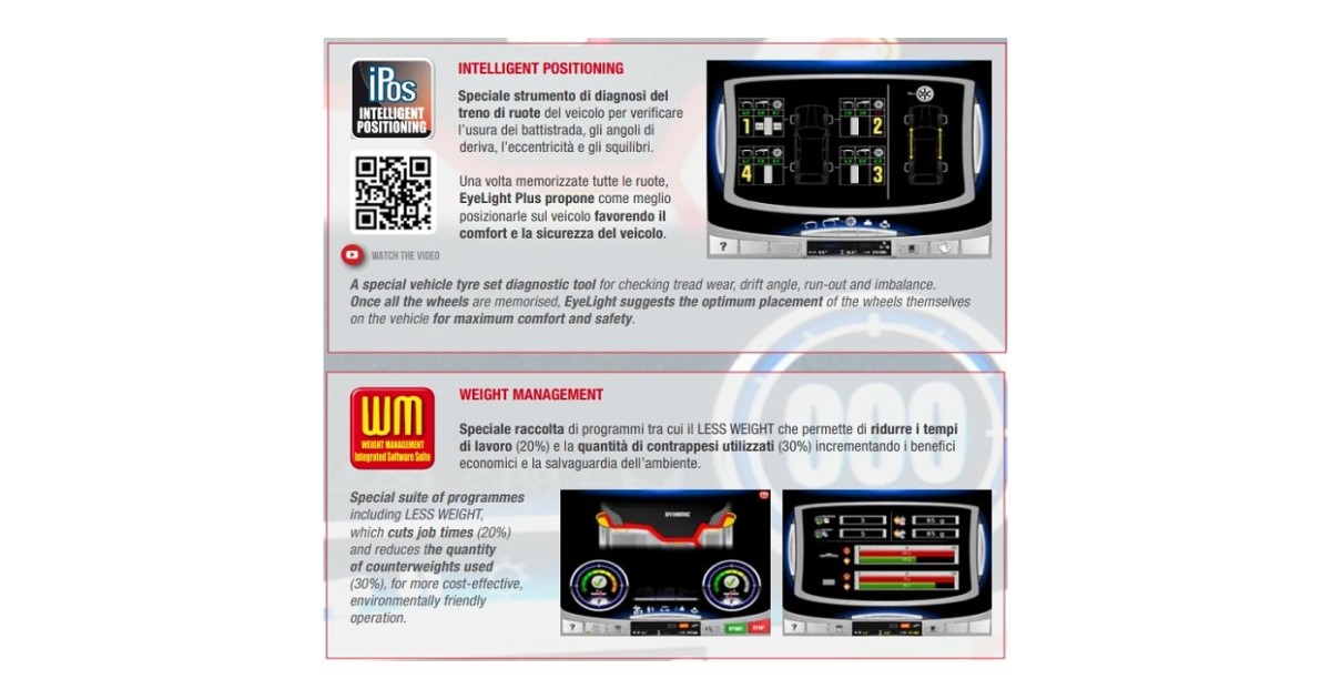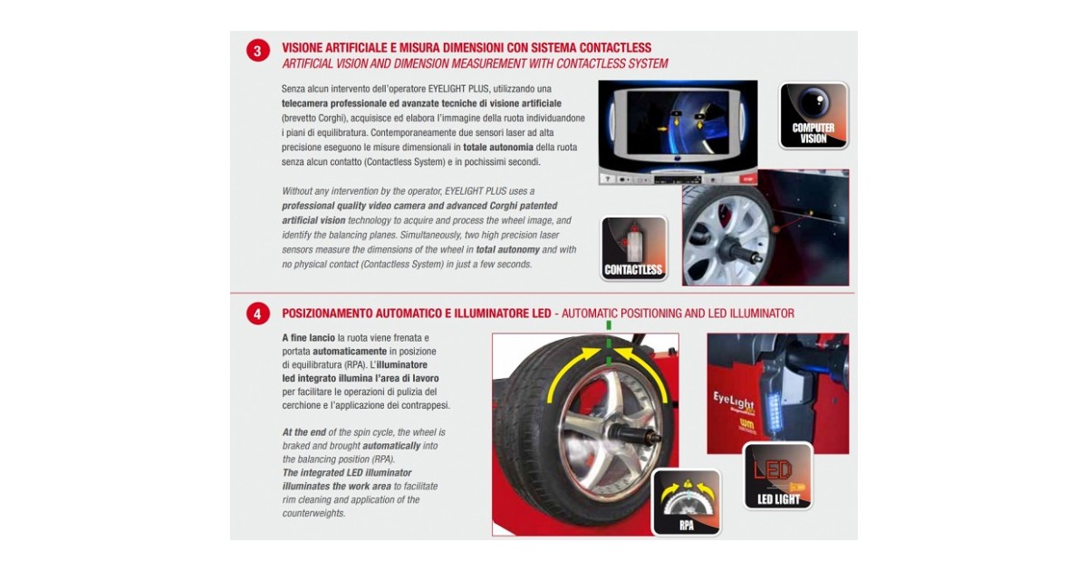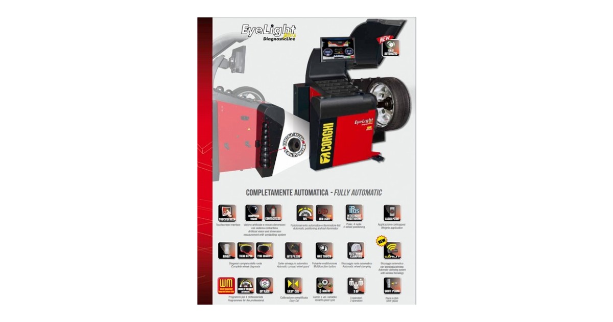 Täisautomaatne diagnostiline tasakaalustuspink. Enne raskuse paigaldamist ei nõua operaatorilt ühtegi manuaalset toimingut. Võrreldes Corghi EM9980 DiagnosticLine Plus masinaga on Eye-Light varustatud ülivõimsa protsessoriga arvutiga ja uuendatud programmiga. seega 40% veelgi kiirem! Diagnostilistest seadmetest kiireim masin turul. Kõik operatsioonid ja teavitused on selge ja ülevaatliku graafikaga nähtavad suurelt ekraanilt. Programmid on valitavad ja juhitavad sama puutetundliku ekraani kaudu. Lisaks kiire ja ergonoomiline "One touch" juhtnupp koos puutetundliku ekraaniga. mis koos annavad ühe kiireima ja mugavaima juhitavusega seadme. Professionaalse kvaliteediga videokaamera kuvab ekraanile velje sisepinna suurendatud kõrgresolutsiooniga pildi. Võimalik läbi vaadelda kogu velje sisepind ja eriti veljeraskuse asukoha kvaliteet ja seisukord.