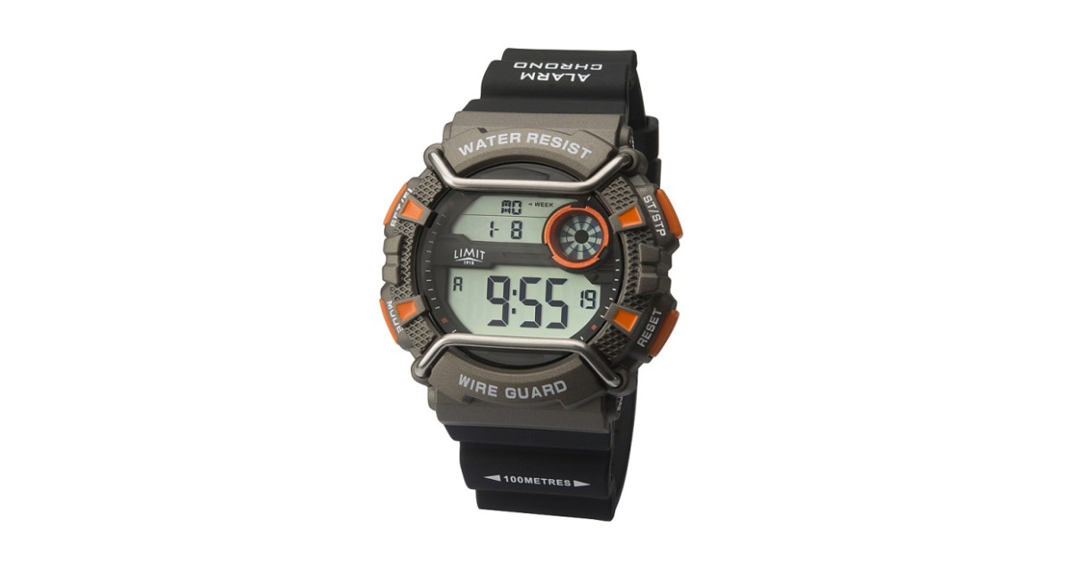To "adventure-proof" this watch, the chunky gun metal-coloured ABS plastic case is protected with stainless steel bars and bolted to a rugged black silicone strap. Its long list of features includes: day/date, stopwatch with lap memory and split time, alarm, and backlight. Water resistant to 100 M a...