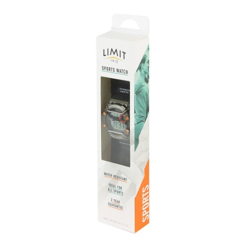 To "adventure-proof" this watch, the chunky gun metal-coloured ABS plastic case is protected with stainless steel bars and bolted to a rugged black silicone strap. Its long list of features includes: day/date, stopwatch with lap memory and split time, alarm, and backlight. Water resistant to 100 M and offered with a 2-year guarantee. Case diameter 50 mm. Gift boxed.
