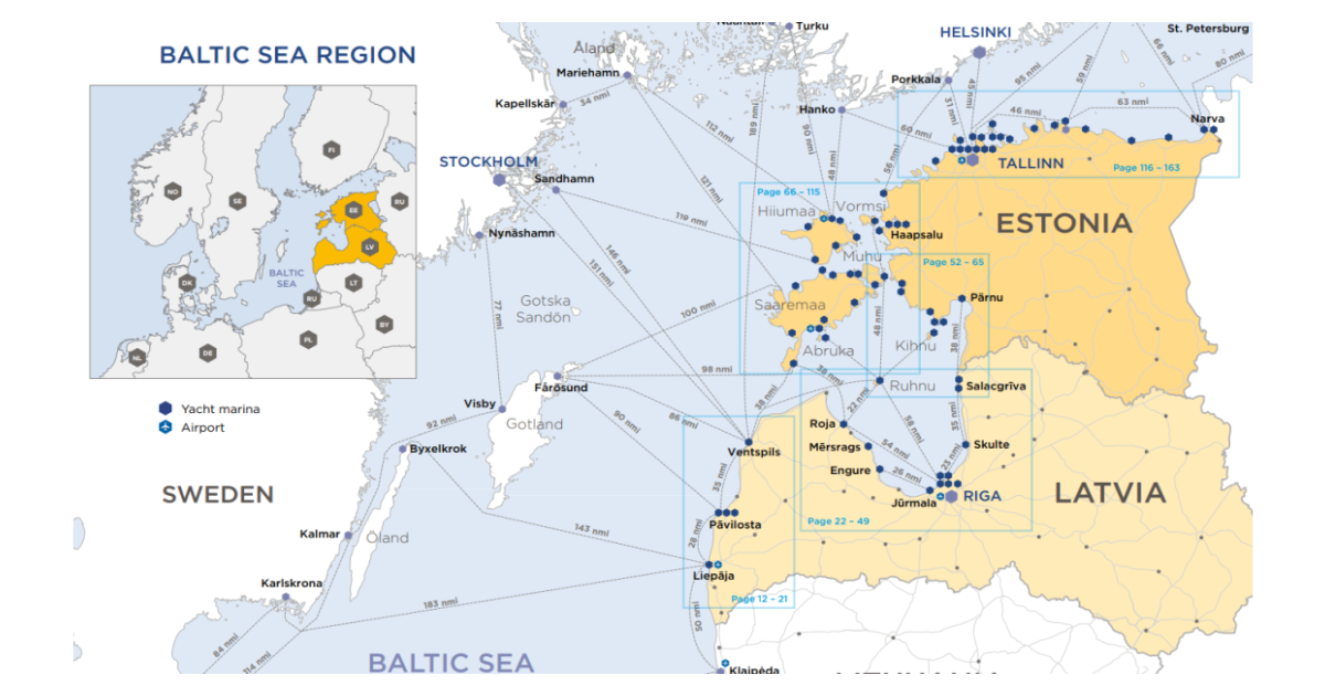 Marinas are presented in five chapters that are arranged geographically, starting from Liepāja Marina in the south and continuing along the coastline to the north: Western Latvia or Kurzeme Coast covers the coastline of the Baltic Sea and continues to the Kolka Cape – the very northern point of Kurzeme region. Marinas in this part are located in estuaries of the largest rivers. From these marinas you have a good connection with Saaremaa Island (Estonia) and Gotland (Sweden). The Gulf of Rīga includes both Latvian and Estonian marinas (chapter Pärnu and southwest Estonia). The Gulf of Rīga is a gentle sailing area, which invites you to enjoy endless sandy beaches. Mooring at the very centre of Rīga, the metropolis of the Baltics, allows you to discover this dynamic port city on the trade route between Western Europe and the East. Enjoy sailing along the coastline and take off to discover the Estonian islands. Western Estonia and islands is comprised of almost 30 marinas, both on the islands and mainland. They are located close to each other, and it is worth it to spend a few hours sailing to visit Saaremaa, Hiiumaa, and several smaller islands, where the unspoiled nature, local traditions, and rural atmosphere will charm you. North Estonia covers the northern part of the East Baltic Coast. Sailing around Tallinn allows you to visit the city or discover smaller islands nearby. Here you may start the journey towards St. Petersburg (Russia) or continue up to Scandinavia – by the shortest route across there are only 45 nmi from Tallinn to Helsinki. May this guide provide you with insights that will make sailing in the East Baltic Coast an unforgettable and pleasant experience!
