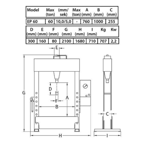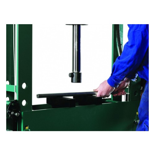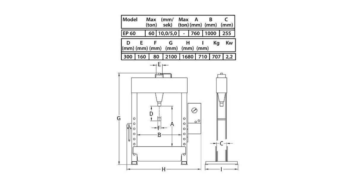 Massiivse ja ülitugeva konstruktsiooniga elektrohüdrauliline press. Külgliikuva surukolviga. Survemanomeetriga. Kergelt ja lihtsalt. vintsi abil tõstetav/langetatav töötasapind. 90° pööratav juhtnuppude paneel võimaldab pikkade detailide pressi vahele asetamist. Klapp töösurve reguleerimiseks. Pikk kolvikäik 300 mm. Laius 1000 mm. sügavus 255 mm. töövahemik 760 mm. Garantii 3 aastat. Valmistatud Taanis.