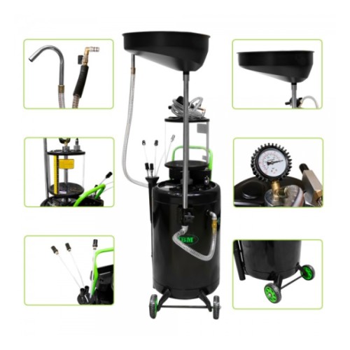 Klaasanumaga õlikoguja. Komplektis kaasas imemiskõrred. Tänu 10 l klaasanumale. millel mõõteskaala. on võimalik hinnata õli mustuse astet. mahtu jne. Õlikollektori maht 10 l. vahekraani ja sõelaga (et õlikork paaki ei kukuks). Ratastel õlipaagi maht 70 l. Kasutab töötamiseks suruõhku. 8-10 bar. Imem...