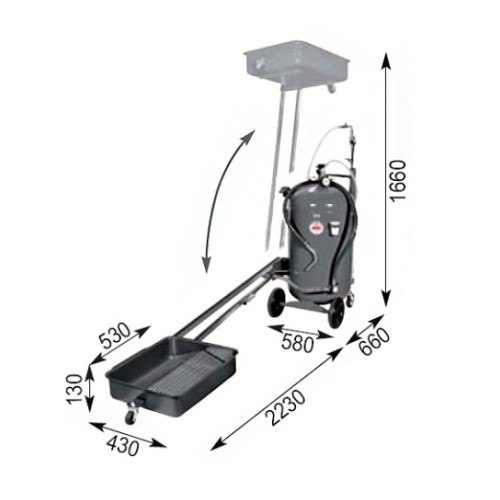 Multifunktsionaalne pneumaatiline vana õli koguja 80 l. kogumisvann 22 l. Reguleeritava kõrgusega ja alla lastava. ratastel kogumiskastiga. Paagi õlitaseme skaala. imi- ja tühjendusvoolik. imikõrred. suruõhusisend. Imufunktsioon mahutisse toimib nii ülestõstetud kui ka allalastud kogumiskastiga.