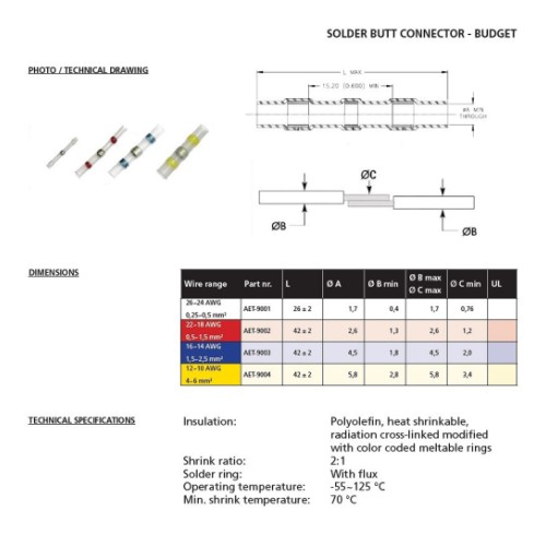 Erakordse isolatsioonivõimega kuuma-. külma- ja veekindlad tinaga termokahanevad jätkutorud. Sobivad tinaga kaetud või katmata vasktraadile. mille temperatuuritaluvus on vähemalt +85°C. Läbimõõt Ø 0.4-1.7 mm. pikkus 26±2 mm. Juhtmele 0.25-0.5 mm² (26-24 AWG). Materjal: polüolefiintoru. milles on termoplastilised. värvikoodiga liimirõngad. Kahanemissuhe 2:1. Kasutustemperatuur -55°C kuni +125°C. Min kahanemistemperatuur +70°C. Pingetaluvus: >600V. mahutakistus: ≥1015 Ω/cm. dielektriline tugevus: ≥ 25 kV/mm. Pakis 10 tk.