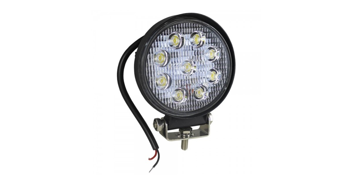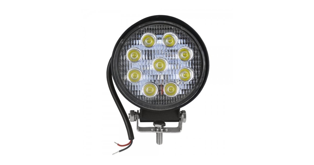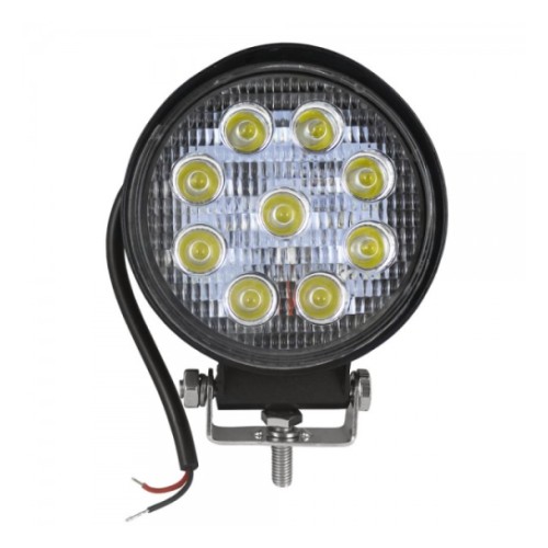 Ümmargune töötuli. hajutatud valgusvihk. Alumiiniumist korpus. 9-LED element. 9-30 V. 27 W. 1800 lm. 6000K valgustemperatuur. IP67. Jala asend reguleeritav ja fikseeritav. roostevabad poldid. Kõrgus 128 mm. läbimõõt 115 mm. paksus vaid 48 mm. Pappkarbis.