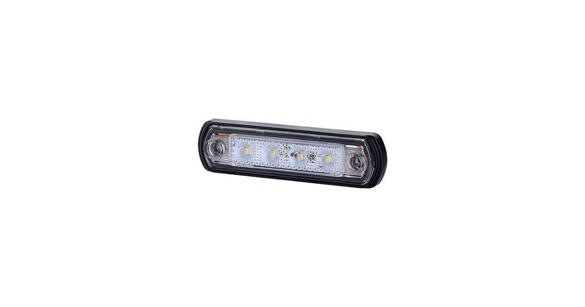 Gabariidituli. 4-LED .valge. Pinnapealne paigaldus. 12/24 V. Ühendusjuhtme pikkus 250 mm. E-markeeritud. IP68. Mõõdud 110x31x18.5 mm. kinnitusavade vahe 82 mm.