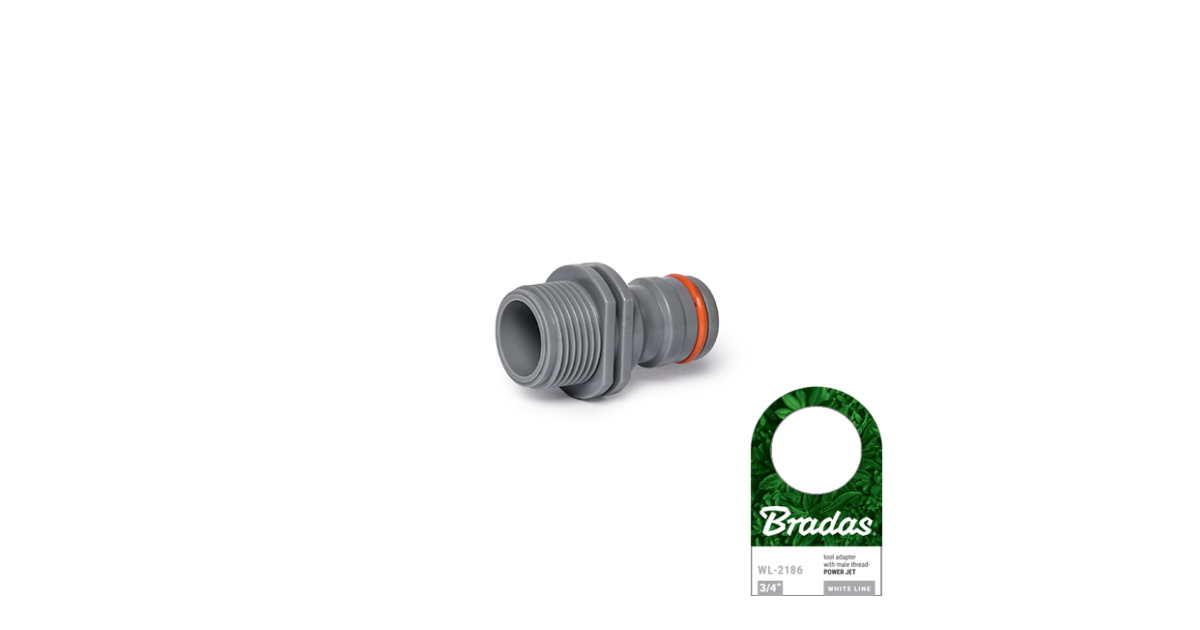 3/4» tool adaptor with male thread that can be used for sprinklers, spray guns and many other garden accessories. Increased water flow diameter causes big working capacity increase. Available in grey color . Each WHITE LINE product has a label with description and barcode.